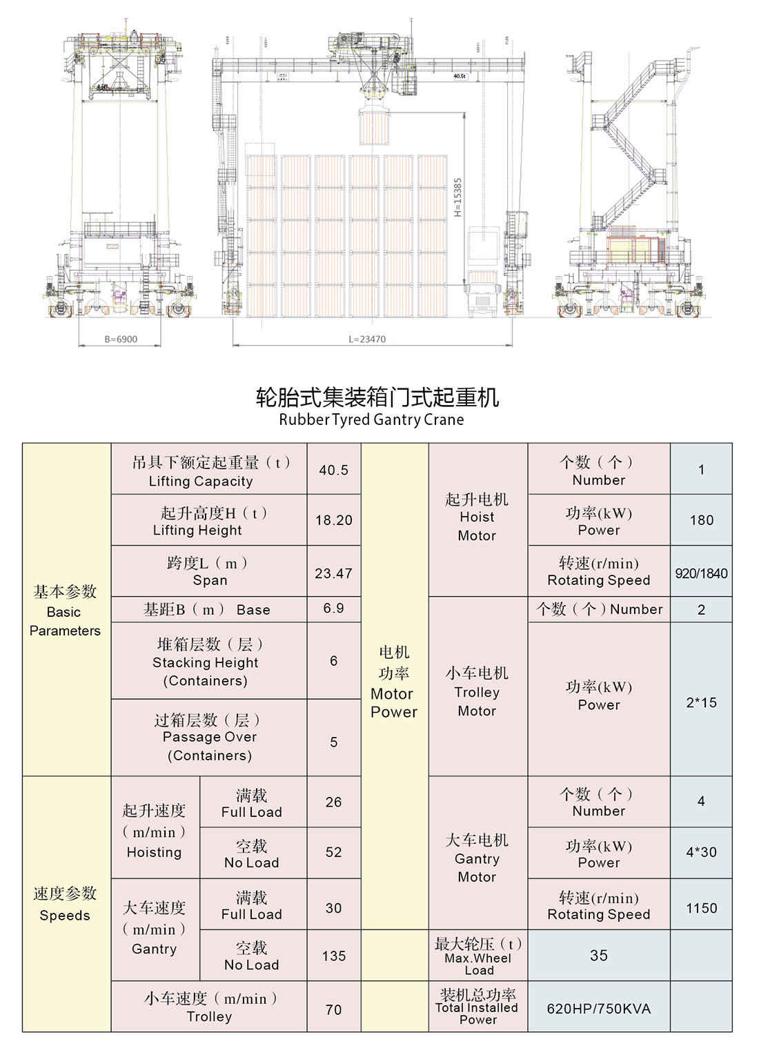 簡稱輪胎式場橋,是集裝箱碼頭堆場或集裝箱貨場進行堆碼作業(yè)的專用裝卸機械,主要由起升機構、小車行走機構、大車行走機構組成。包含兩個U型門框與底梁組成門式架,支承在充氣橡膠輪胎上,可在規(guī)定的行車通道上行走??砂礉L裝發(fā)運的方式向客戶提供所需的輪胎式集裝箱門式起重機。