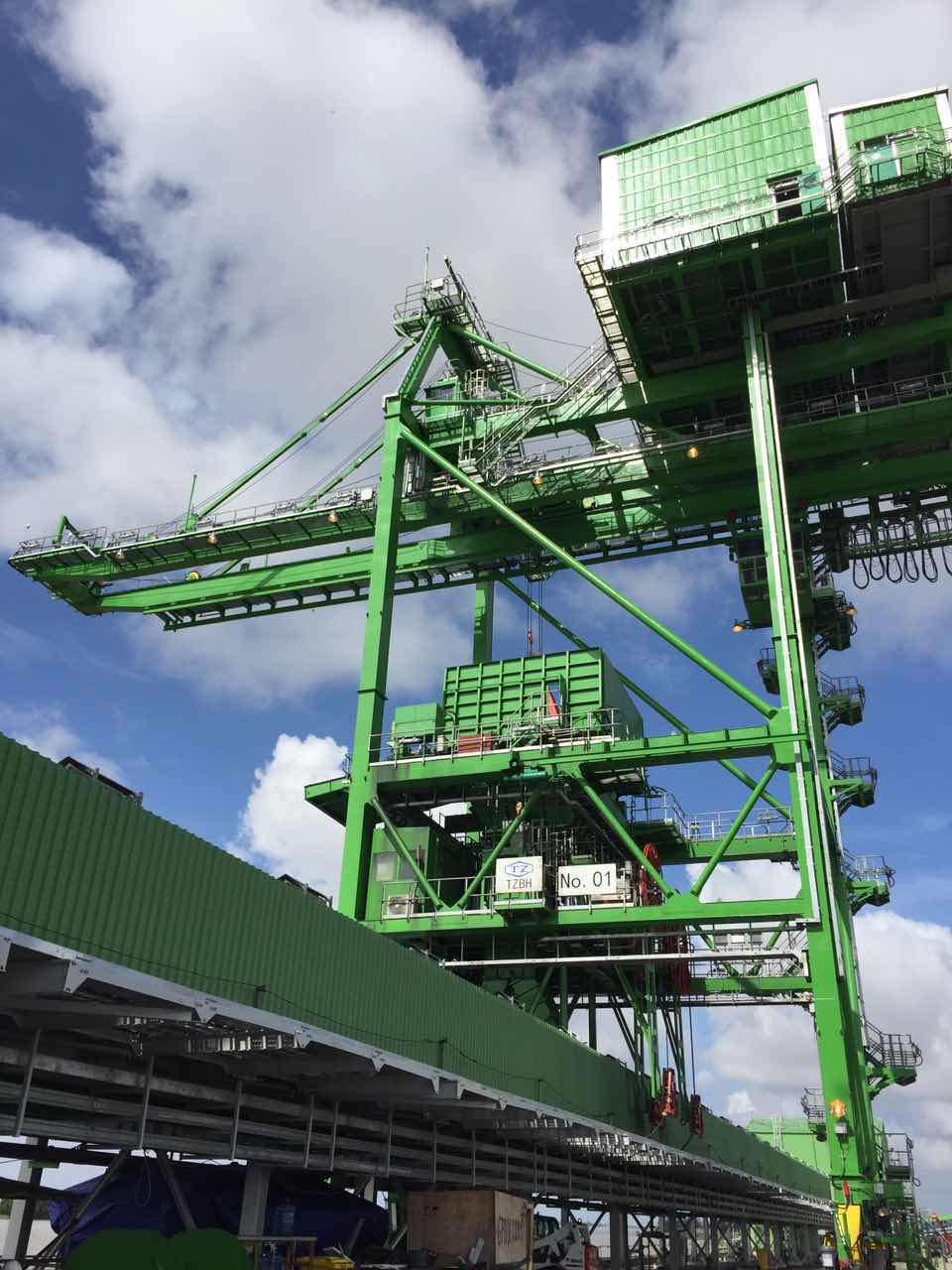 橋式抓斗卸船機,以帶有抓斗的小車沿橋架作周期運行的散貨卸船機。作業(yè)時,抓斗自船艙抓取散貨并提升出倉后載重小車向岸方運行,將散貨卸入前門框內(nèi)的漏斗內(nèi),經(jīng)膠帶輸送機系統(tǒng)送入貨場。