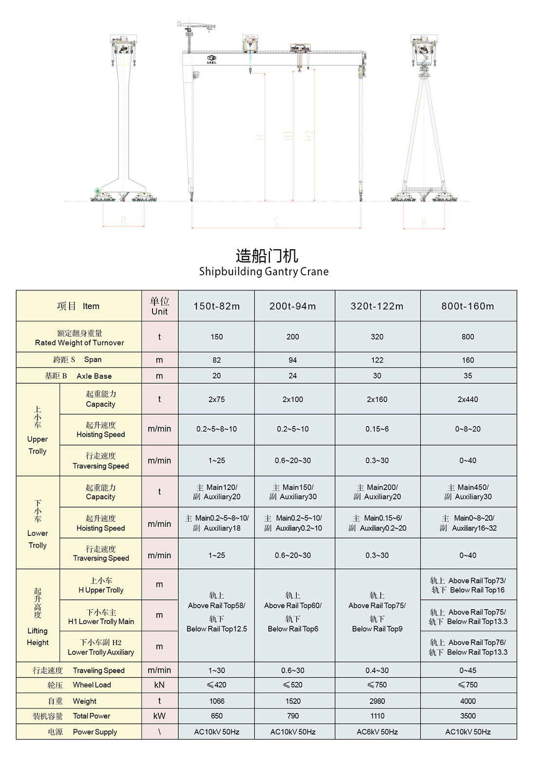 造船門機(jī)在地面軌道上運行,用于船塢等大型焊接件吊裝作業(yè)的大型龍門起重機(jī),由水平橋架設(shè)置在兩條支腿上構(gòu)成門架形狀的橋架型起重機(jī)。其起升、小車運行、橋架與橋式起重機(jī)相同。