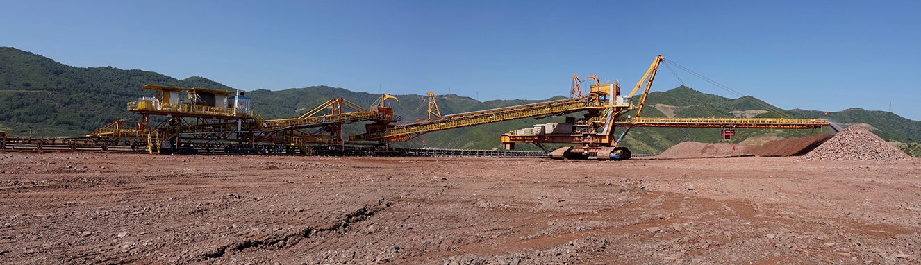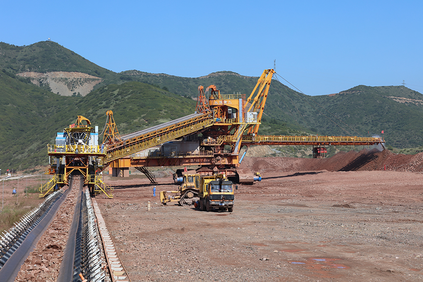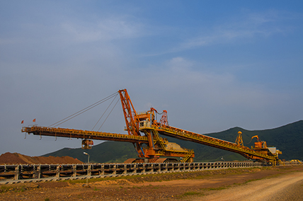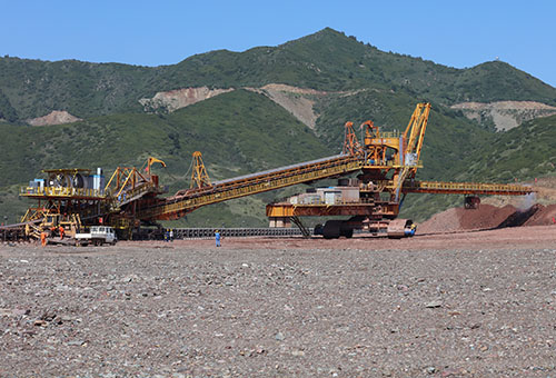 排土機位于大型露天礦山半連續(xù)開采系統(tǒng)的末端,用于運輸和排棄物料。排土機與卸料車協(xié)同工作:卸料車完成物料的提升,將物料傳送至排土機的受料皮帶上,排土機將卸料車輸送來的物料通過排料臂有序排棄至排土場;排土機與卸料車互鎖聯(lián)動完成排土作業(yè)。排土機按照排土工藝隨排土場的推進而移動。