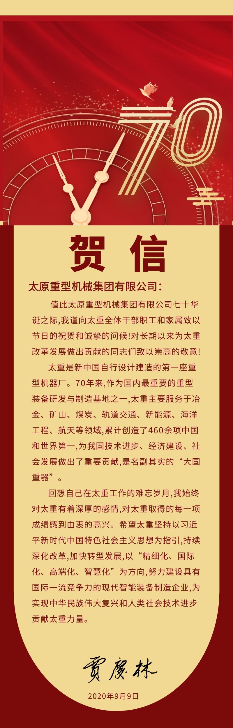 【賀信】太重老廠長賈慶林同志祝賀太重建廠70周年!