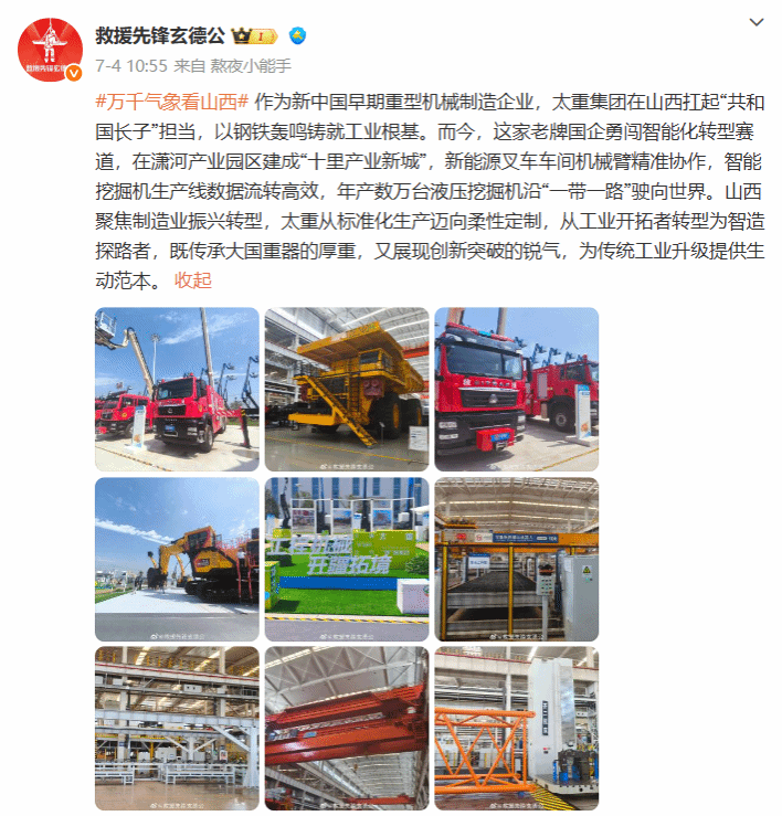 @使徒子:“太科幻了!強(qiáng)烈要求客串《流浪地球》?!?/span>@江氏小盜龍:“吹著空調(diào)去挖礦,智能化太強(qiáng)了吧!”@何春銀微想:激情賦詩《太重太牛》七言律詩,贊嘆現(xiàn)代工業(yè)的蓬勃?dú)庀蟆?/span>國家級(jí)媒體的強(qiáng)勢站臺(tái),讓這場盛況更加出圈。新華網(wǎng)客戶端以《網(wǎng)絡(luò)名人走進(jìn)太重集團(tuán),看工業(yè)大塊頭的“智”變》為題進(jìn)行深度報(bào)道,解碼太重智變密碼。
