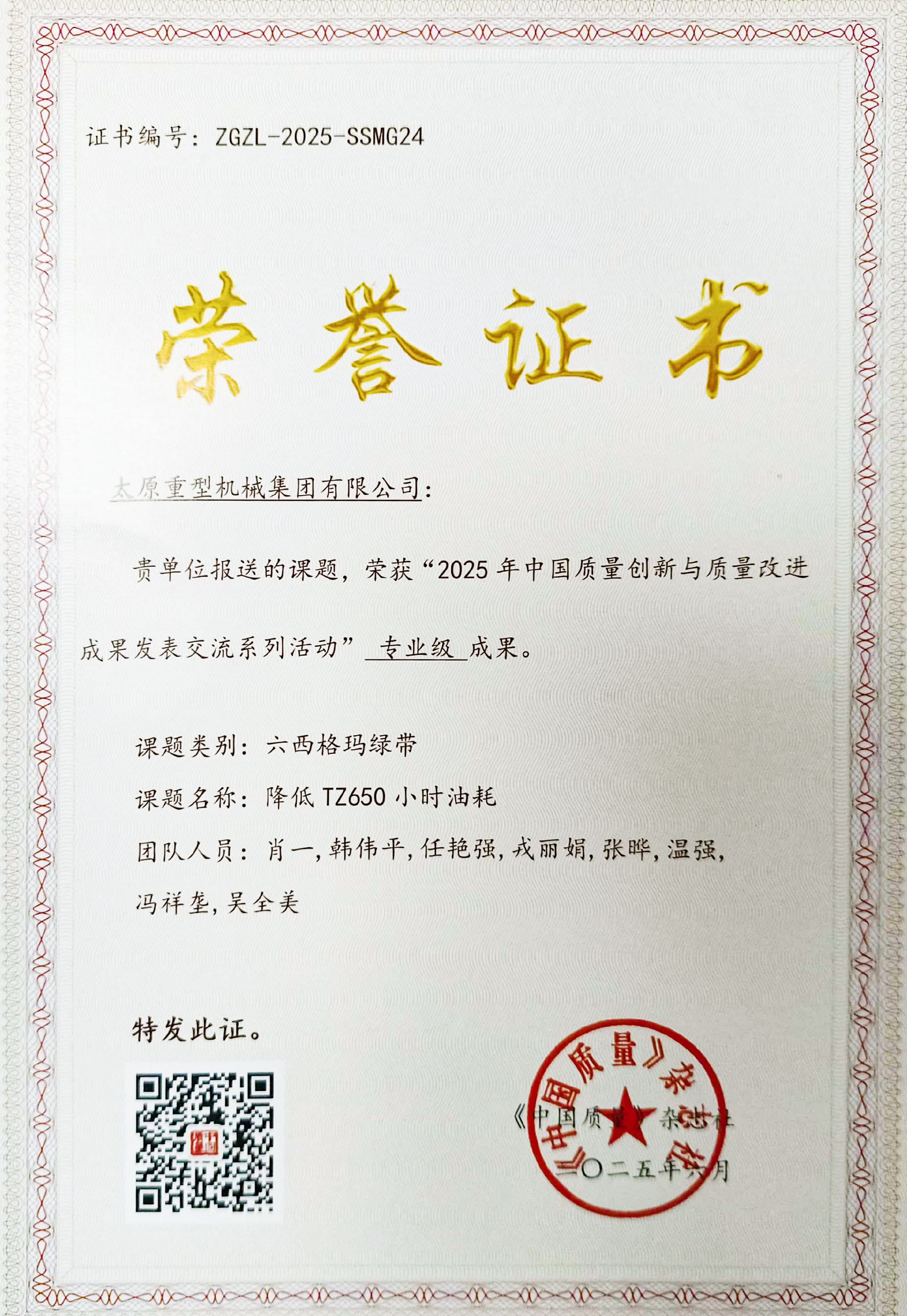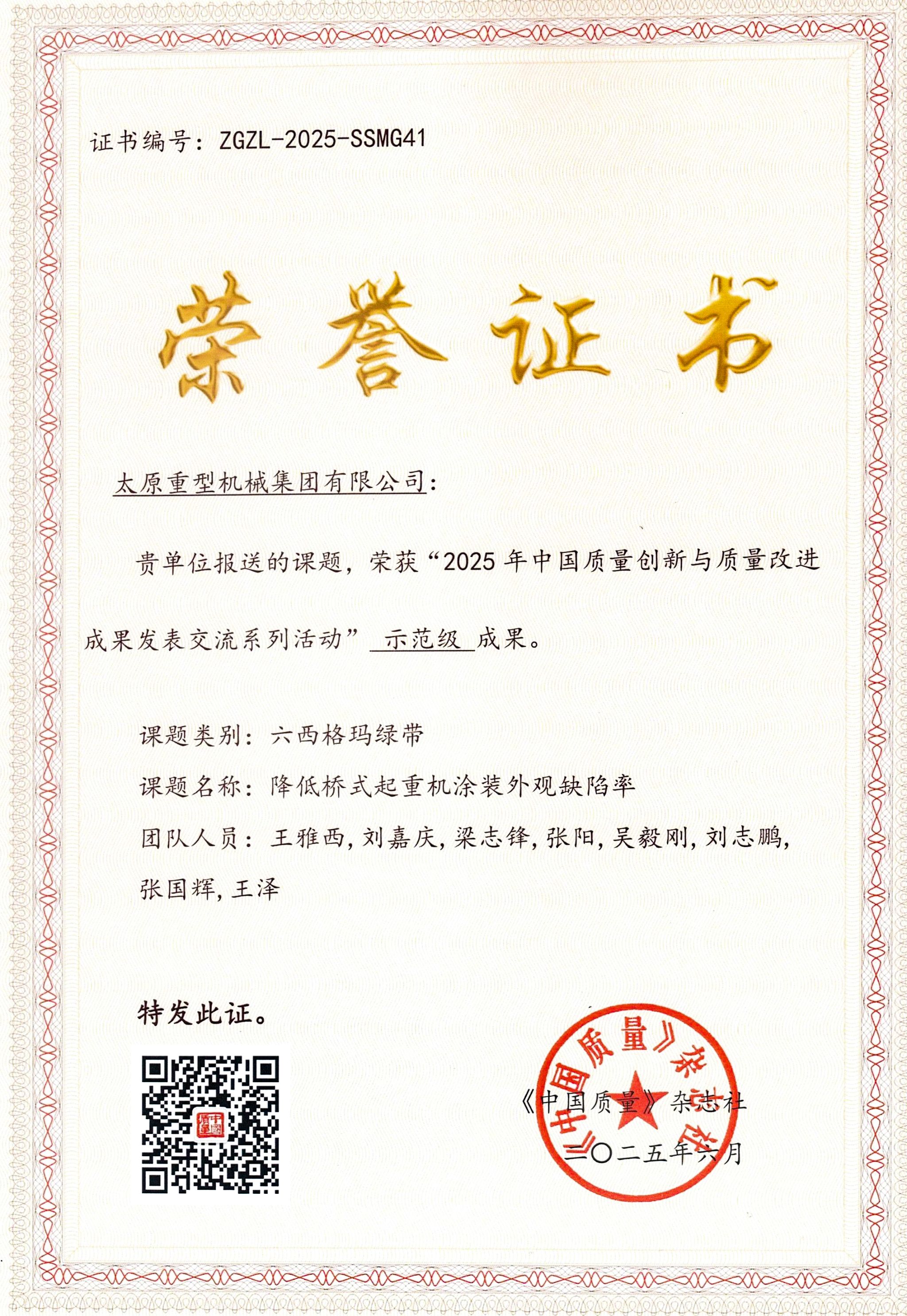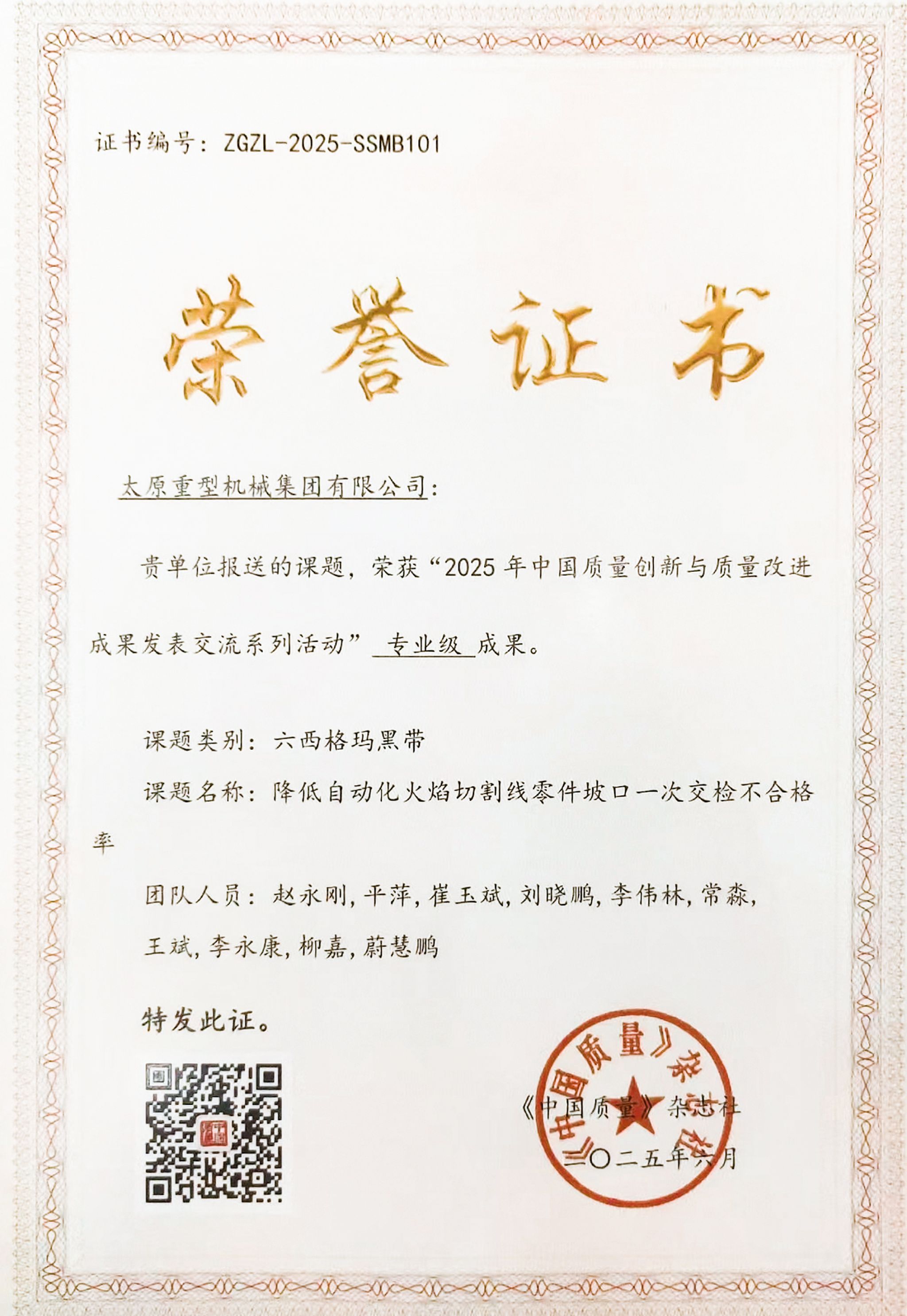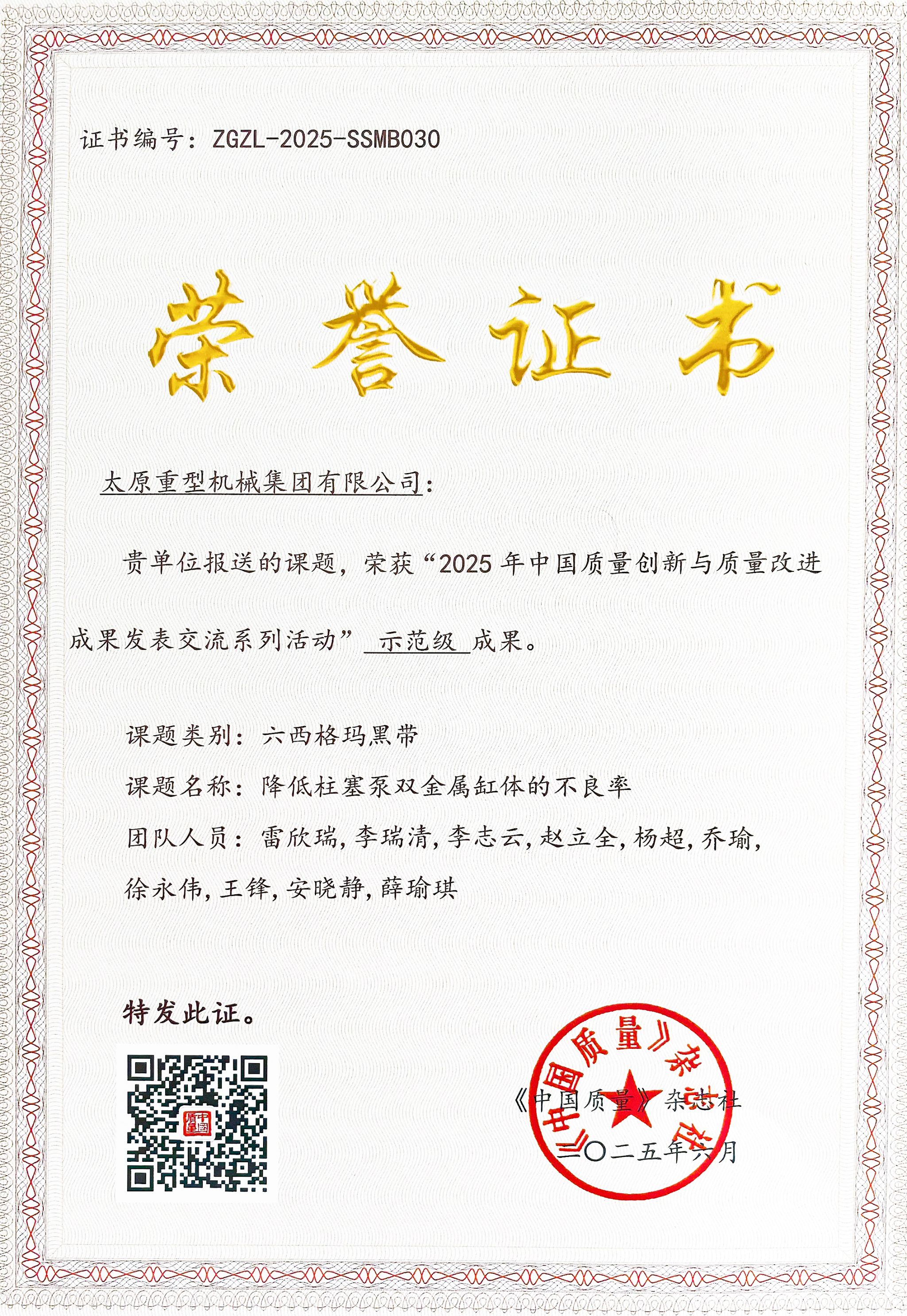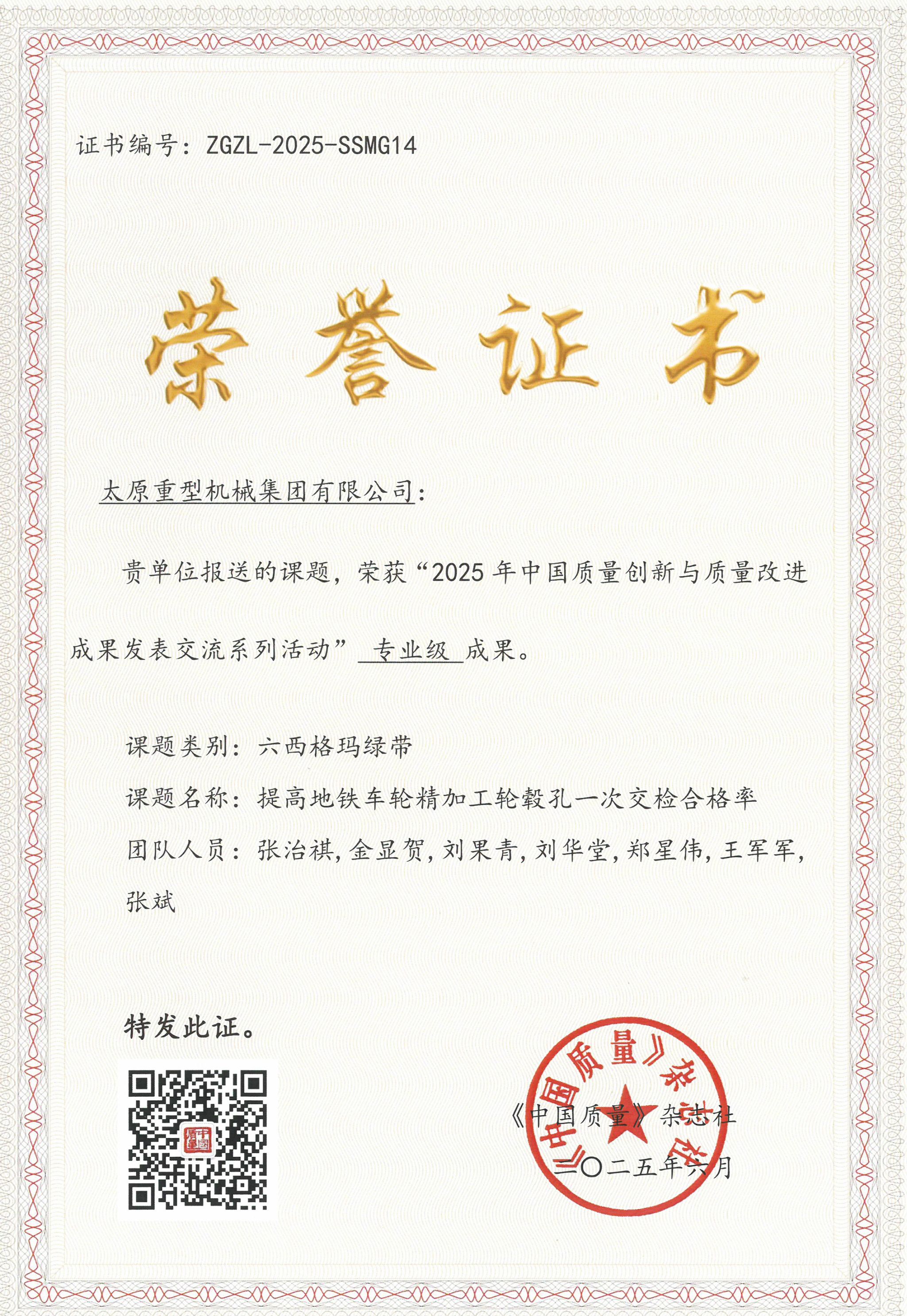 這份成績源自持續(xù)的質(zhì)量管理投入。在中國質(zhì)量協(xié)會《中國質(zhì)量》雜志社組織的“2025年中國質(zhì)量創(chuàng)新與質(zhì)量改進成果發(fā)表交流系列活動”中,太重報送的6項六西格瑪成果憑借突出的技術創(chuàng)新性和實際效益脫穎而出,成功斬獲“示范級”“專業(yè)級”成果獎項,這也是太重連續(xù)第二年在該權威活動中榮獲獎項。