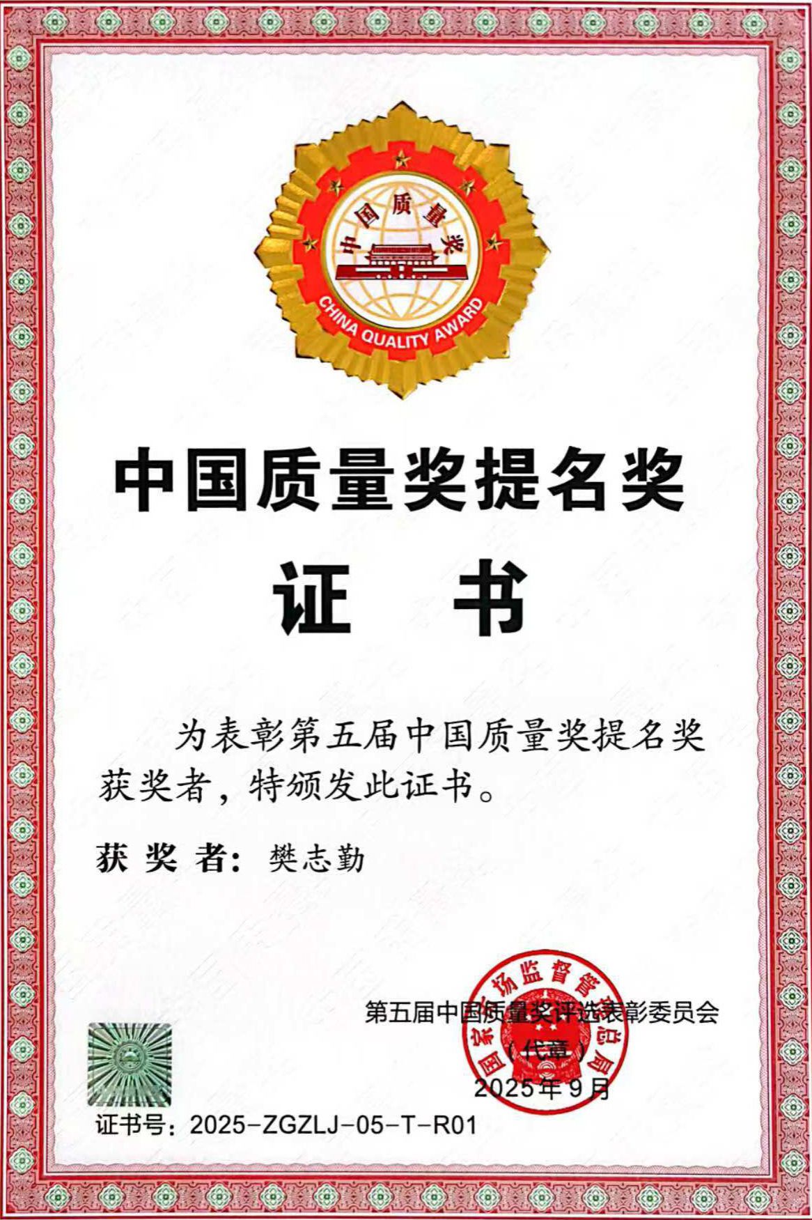 第五屆中國(guó)質(zhì)量獎(jiǎng)?wù)筋C發(fā)