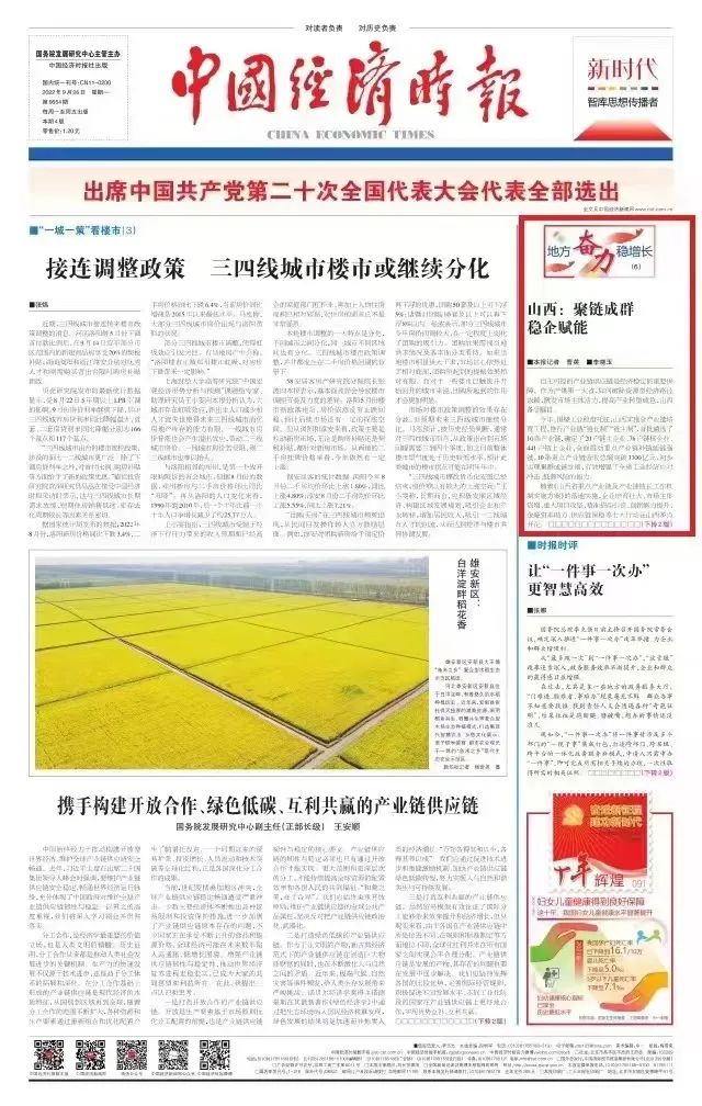 今日,中國經濟時報頭版以《山西:聚鏈成群 穩(wěn)企賦能》為題,重點關注太重集團憑借在高端裝備制造和風電裝備領域的突出優(yōu)勢,成為山西省唯一的“雙鏈主”企業(yè),主動發(fā)揮“鏈主”企業(yè)的引領支撐作用,精準延鏈補鏈強鏈,推動形成全省“一企帶一鏈、一鏈帶一片”的產業(yè)發(fā)展格局。