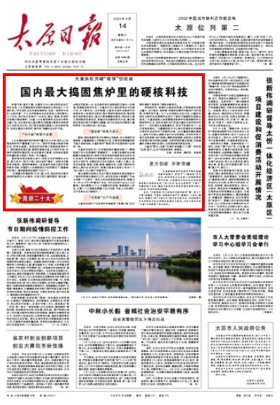 9月14日,太原日報頭版頭條《喜迎二十大》專欄,刊發(fā)文章《太重焦化突破“瓶頸”創(chuàng)效益 國內(nèi)最大搗固焦?fàn)t里的硬核科技》,報道太重集團聚焦“雙碳”目標(biāo),加快培育能源科技創(chuàng)新領(lǐng)域新路徑,從具備制造國際先進水平焦?fàn)t機械成套設(shè)備能力,到首開“一鍵煉焦”技術(shù)先河,再到研發(fā)出全國最大的智能搗固焦?fàn)t設(shè)備,“核心技術(shù)”的自主創(chuàng)新和“卡脖子”問題的逐個攻破,推動了我國焦化裝備制造在國際市場上從跟跑、并跑到領(lǐng)跑的跨越。