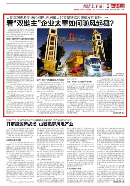 10月17日,山西晚報刊發(fā)《看“雙鏈主”企業(yè)太重如何隨風起舞?》文章,對太重集團3款大功率風電機組、550噸鑄造起重機、核電環(huán)軌梁進行報道。太重集團作為我省唯一一家“雙鏈主”企業(yè),深耕智能高端裝備制造和風電裝備領域,實施一系列提質(zhì)、增效、擴量的升級改造項目,實現(xiàn)“設計研發(fā)、智能控制、三電總成、整體集成”的發(fā)展格局,集聚產(chǎn)業(yè)鏈優(yōu)勢資源,強化上下游產(chǎn)業(yè)協(xié)同,勇?lián)版溨鳌逼髽I(yè)責任,推動我省制造業(yè)高質(zhì)量發(fā)展,為轉型發(fā)展蹚新路持續(xù)注入強勁動能。