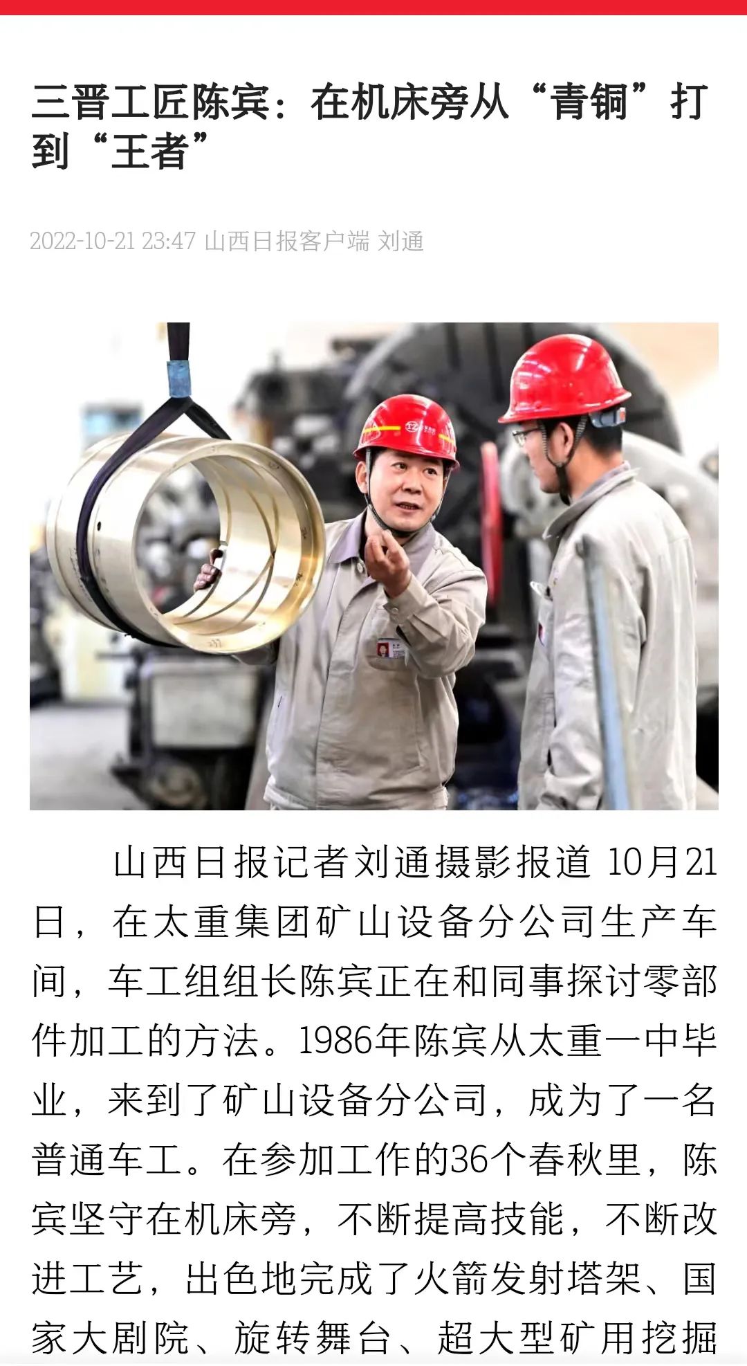 10月21日,山西日報以《三晉工匠陳賓:在機床旁從“青銅”打到“王者”》為題,對太重職工陳賓進行了報道。陳賓36年來潛心鉆研、不斷創(chuàng)新、精益求精,致力于大型關(guān)鍵零件的精加工任務(wù),成為一名名副其實的“三晉工匠”。