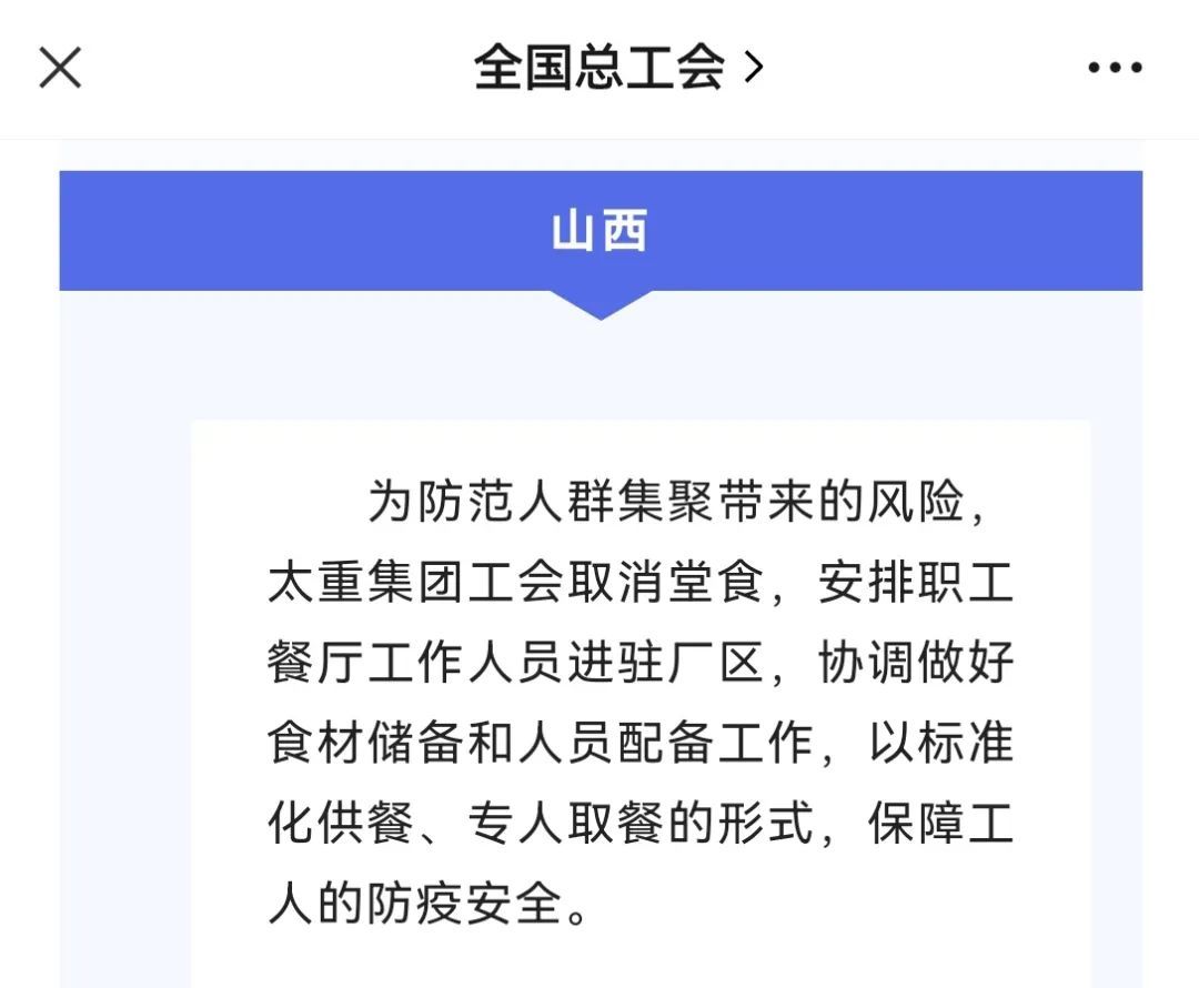 為防范人群集聚帶來的風險,太重集團工會取消堂食,安排職工餐廳工作人員進駐廠區(qū),協(xié)調(diào)做好食材儲備和人員配備工作,以標準化供餐、專人取餐的形式,保障工人的防疫安全。