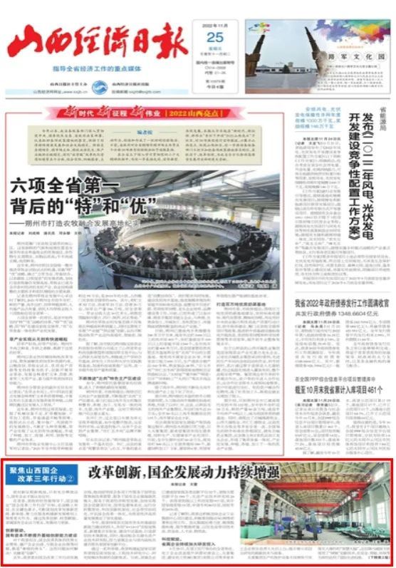 11月25日,山西經(jīng)濟日報頭版《聚焦山西國企改革三年行動》專欄,刊發(fā)文章《改革創(chuàng)新,國企發(fā)展動力持續(xù)增強》,報道太重集團圍繞“雙碳”目標要求,以“前瞻性、可靠性、先進性”和“國產(chǎn)化、智能化、人性化、綠色化、輕量化”為目標,強化技術(shù)攻關(guān)力度,不斷提高焦化設(shè)備的環(huán)保技術(shù)、工藝、裝備水平,為我國焦化行業(yè)的轉(zhuǎn)型升級和持續(xù)發(fā)展奠定了基礎(chǔ),為助力國家實現(xiàn)“雙碳”目標展現(xiàn)了國企擔當。下面對太重集團相關(guān)內(nèi)容進行轉(zhuǎn)載。