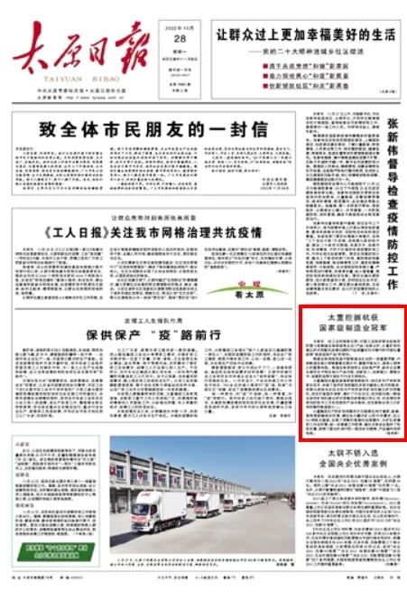 11月28日,太原日報頭版以《太重挖掘機獲國家級制造業(yè)冠軍》為題對太重集團進行報道。深化改革以來,太重集團深耕重型裝備領(lǐng)域,擔當高端裝備制造“鏈主”責任,加大前沿技術(shù)研發(fā)和關(guān)鍵核心技術(shù)攻關(guān)力度,加快轉(zhuǎn)型升級步伐,為公司高質(zhì)量高速度發(fā)展提供“硬核”力量。