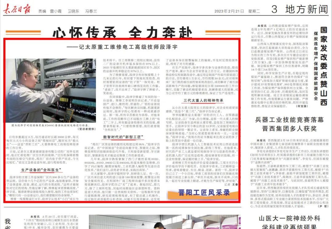 日前,太重集團齒輪傳動分公司電工段澤宇榮獲了太原市第四屆“晉陽工匠”榮譽稱號。《太原日報》于日前對其事跡進行了宣傳報道。
