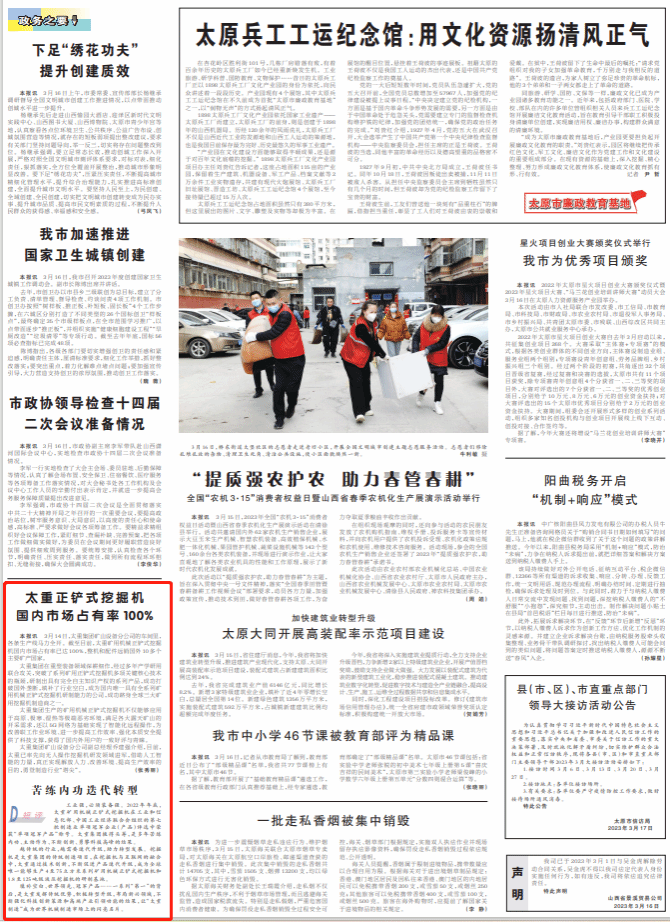 近期,太原日報以《太重正鏟式挖掘機國內(nèi)市場占有率100%》為題對太重集團礦用挖掘機勇登行業(yè)“塔尖”進行報道。太重集團大力實施科技創(chuàng)新和人才強企戰(zhàn)略,堅持把創(chuàng)新擺在公司轉型發(fā)展全局的核心位置,為太重在全省轉型發(fā)展中發(fā)揮龍頭帶動作用聚力賦能。