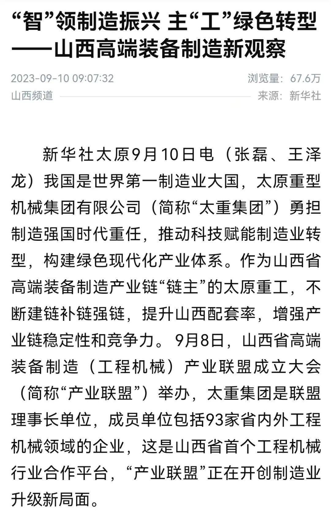 高端裝備制造產業(yè)鏈作為山西省培育打造的重點十條產業(yè)鏈之一。太重集團將以產業(yè)聯盟為契機,充分發(fā)揮“鏈主”企業(yè)的龍頭帶動作用,為山西省建設中部地區(qū)先進制造業(yè)基地做出積極貢獻。