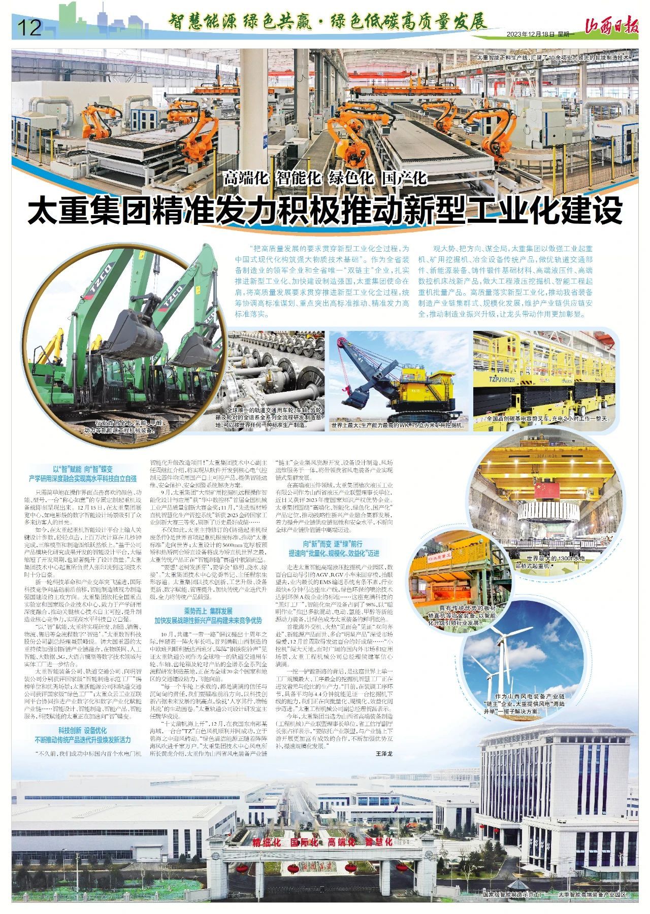 今日,山西日報整版刊發(fā)《高端化 智能化 綠色化 國產(chǎn)化 太重集團精準發(fā)力積極推動新型工業(yè)化建設(shè)》文章,從產(chǎn)學研用深度融合、傳統(tǒng)產(chǎn)品迭代升級、加快發(fā)展戰(zhàn)略性新興產(chǎn)品、打造綠色批量裝備等方面,詳細報道太重高質(zhì)量落實新型工業(yè)化的生動實踐,講述公司作為全省唯一“雙鏈主”企業(yè),持續(xù)推動我省裝備制造產(chǎn)業(yè)鏈集群式、規(guī)模化發(fā)展的務(wù)實之舉。