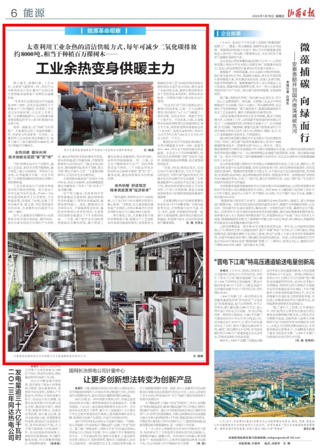 今日,山西日?qǐng)?bào)《能源革命觀察》專欄,對(duì)太重集團(tuán)聚焦國家“雙碳”目標(biāo),通過技術(shù)創(chuàng)新變廢為寶,將工業(yè)余熱變身供暖主力進(jìn)行了重點(diǎn)報(bào)道。一直以來,太重集團(tuán)持續(xù)踐行“綠水青山就是金山銀山”理念,著力構(gòu)建綠色環(huán)保長效工作機(jī)制,加快推動(dòng)公司綠色低碳轉(zhuǎn)型發(fā)展,為實(shí)現(xiàn)國家戰(zhàn)略貢獻(xiàn)太重力量、展現(xiàn)國企擔(dān)當(dāng)。