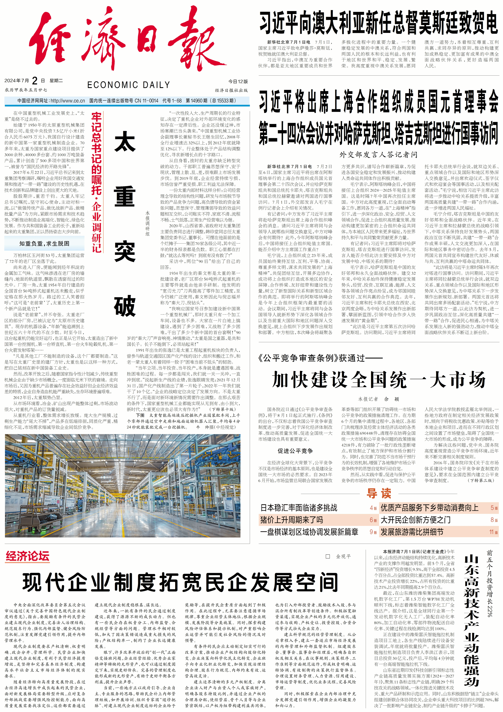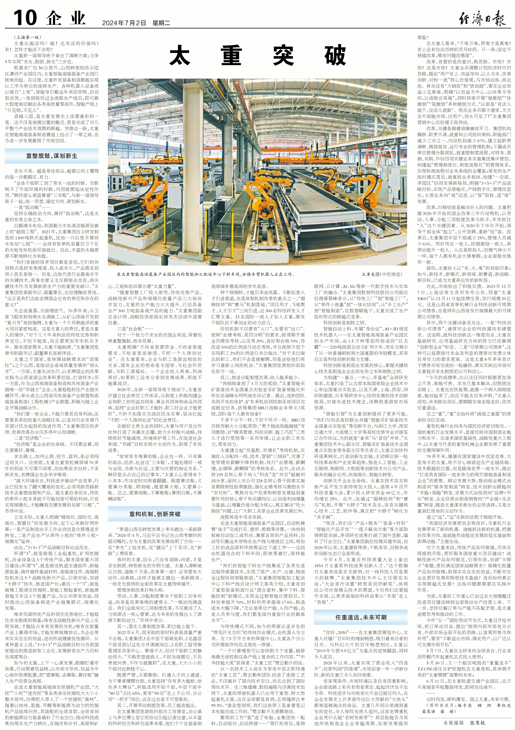 今日,《經(jīng)濟日報》在【牢記總書記的囑托·企業(yè)調(diào)研記】專欄刊發(fā)文章《太重突破》,頭版頭條、萬字報道,以太重之變、之最、之智、之綠、之速,展示太重以科技創(chuàng)新推動產(chǎn)業(yè)創(chuàng)新的先進(jìn)做法,介紹太重推動制造業(yè)振興崛起、實現(xiàn)“老樹發(fā)新芽”的先進(jìn)經(jīng)驗。