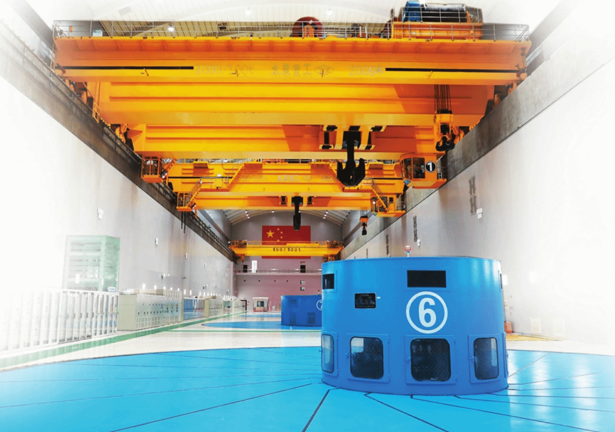 踏入這座智能化水平位居世界前列的水電站主廠房,映入眼簾的是震撼的工業(yè)圖景,耳中持續(xù)回響側(cè)排電箱發(fā)出的規(guī)律嗡鳴。廠房上空數(shù)十米處,太重研制的兩臺1000t橋式起重機(jī)正有條不紊地吊起巨大構(gòu)件緩緩掠過高空,精準(zhǔn)地運(yùn)往指定地點(diǎn)。沒有想象中的劇烈震顫與遲緩操作,所有動作都流暢而精準(zhǔn),令人贊嘆。
