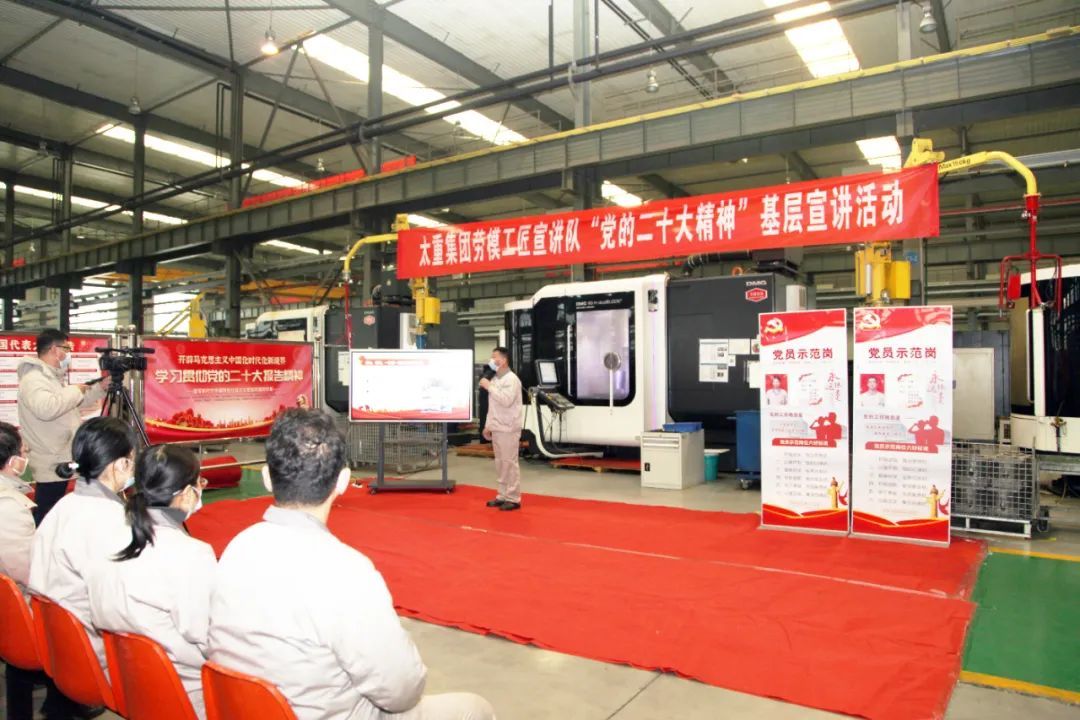 在太重榆液液壓泵分廠車間現(xiàn)場(chǎng),伴隨著機(jī)器的轟鳴聲,黨的二十大精神宣講活動(dòng)也正在火熱進(jìn)行中。集團(tuán)公司“勞模工匠”宣講隊(duì)成員,山西省勞動(dòng)模范、省級(jí)勞模創(chuàng)新工作室?guī)ь^人常永紅,正在為他的工友們宣講黨的二十大精神。生產(chǎn)車間既是他每天工作戰(zhàn)斗的地方,也是他宣講黨的創(chuàng)新理論的陣地。他結(jié)合崗位實(shí)際談心得、說(shuō)體會(huì)、講感受,推動(dòng)黨的二十大精神走進(jìn)基層一線、走進(jìn)職工心里,唱響新時(shí)代奮斗者之歌。